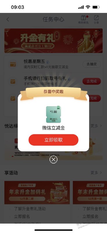 活动时间:2026年1月1日至1月31日活动路径:建设银行app,搜【惠省钱】->支付达标赢好礼一个2个任务:①.月月好礼当月使用建行卡在微信支付满5000/10000/30000元,可分别获得1次抽奖机会(最高666元),抽奖时间为次月9日9点后。如何完成:微信零钱通,直接单笔或多笔转入,累计30001元即可,零钱通银行卡转入的金额是可以免费提现的,但是不要当天转入当天转出,以防风控。②.当月加码福利完成任务1,且当月使用建行卡在微信支付满15笔,可额外抽1次。