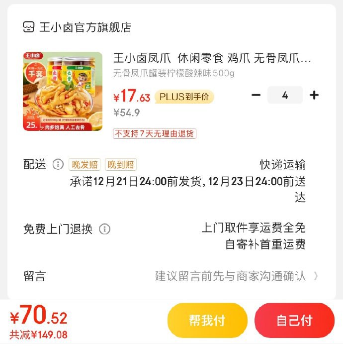 🚦 领2张券 王小卤罐装无骨凤爪500g 拍4件71.8元 折17.9元/份