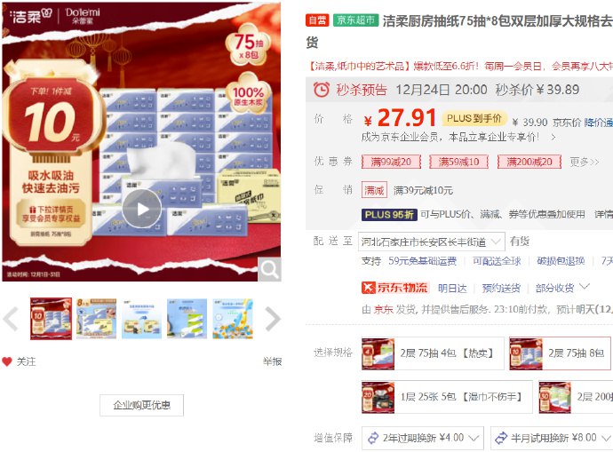 洁柔 双层加厚大规格 厨房抽纸75抽×8包,部分用户砸落10券 首购礼金,11.91