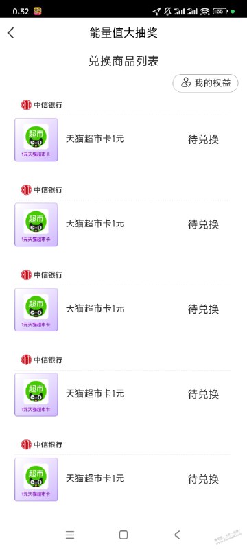 中信能量抽,抽了5次天猫超市卡