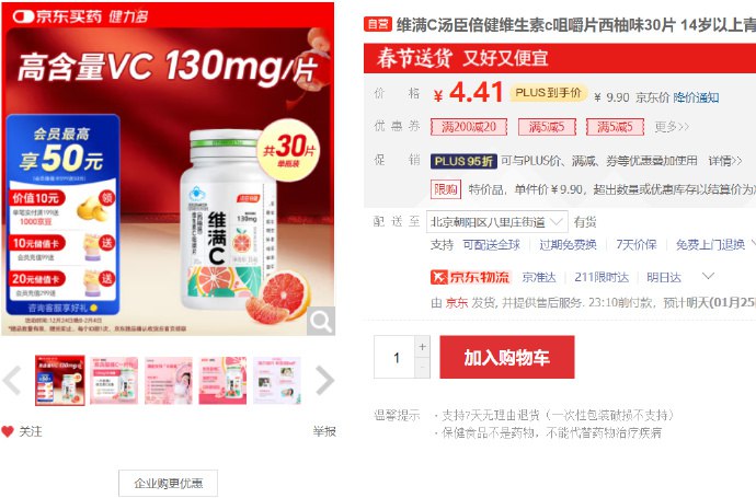 维满C汤臣倍健维生素c咀嚼片西柚味30片,4.41