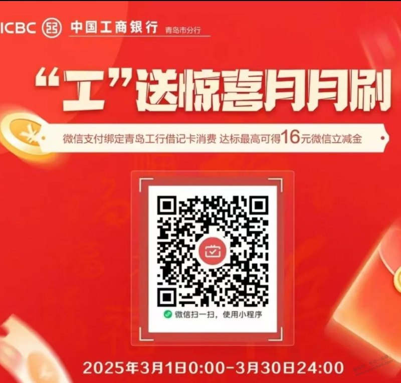 青岛工行月月刷16立减金
