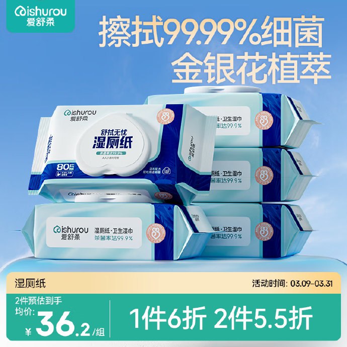 🚦 领黑五200-20补贴奍 叠加2首购礼金 爱舒柔 湿厕纸80片×5包 拍1件 爱