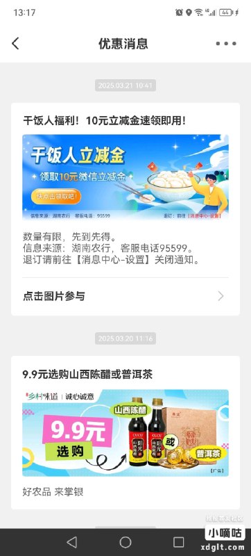 农行湖南,点击消息,优惠消息,有干饭人福利10立减金,两万份,先到先得。