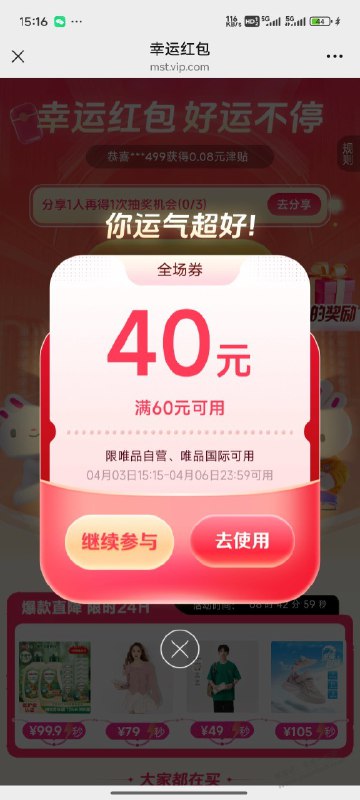有水速度抽唯品免邮、全品劵60-40