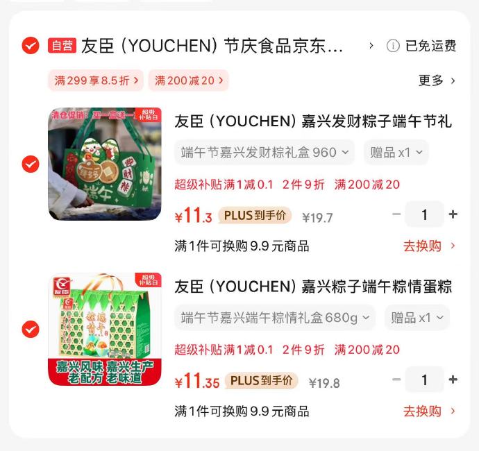 🚦 底部点“主会场”领取200-20券×3张 京东PLUS会员9折消费券友臣 嘉兴发财粽子礼盒9