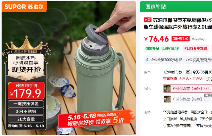 🚦 底部点“主会场”领取200-20券×3张 京东PLUS会员9折消费券苏泊尔保温壶不锈钢保温水