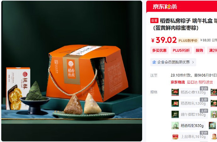 🚦 底部点“主会场”领取200-20券×3张 京东PLUS会员9折消费券稻香私房粽子 端午礼盒
