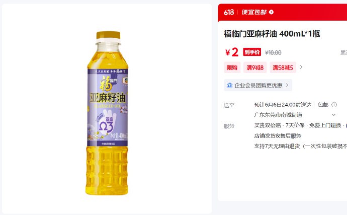9-8券 消灭红包福临门亚麻籽油 400mL×1瓶,2