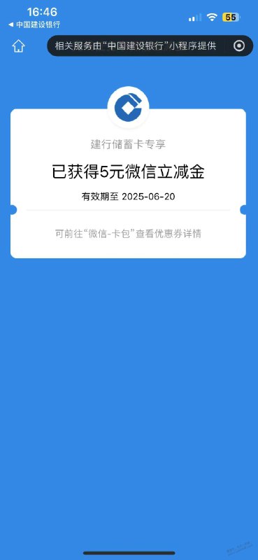 建行缴费2-5元立减金,中了5元!