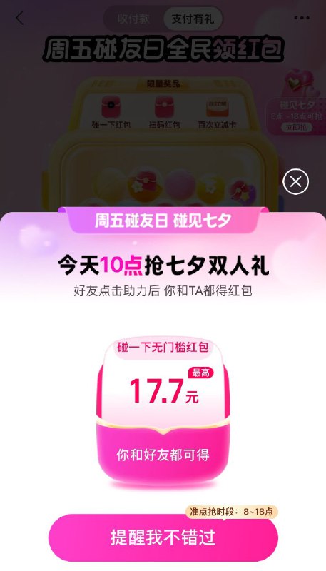 10点,支付宝搜周五碰友日抢17.7无门槛
