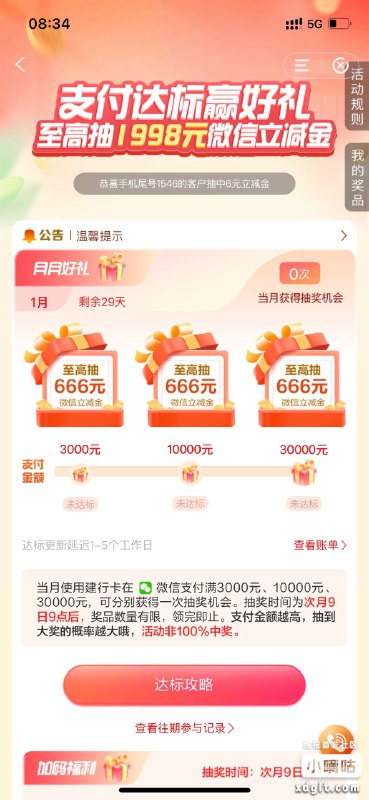 活动时间:2026年1月1日至1月31日活动路径:建设银行app,搜【惠省钱】->支付达标赢好礼一个2个任务:①.月月好礼当月使用建行卡在微信支付满5000/10000/30000元,可分别获得1次抽奖机会(最高666元),抽奖时间为次月9日9点后。如何完成:微信零钱通,直接单笔或多笔转入,累计30001元即可,零钱通银行卡转入的金额是可以免费提现的,但是不要当天转入当天转出,以防风控。②.当月加码福利完成任务1,且当月使用建行卡在微信支付满15笔,可额外抽1次。
