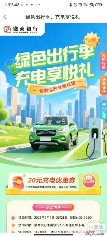 徽商银行每月一次 充电21-20 成本6 海鲜市场润10 抽立减金也是每月一次 名额每天都要抢 充电名额是6点刷新 立减金名额是8点刷新 自己蹲一下
