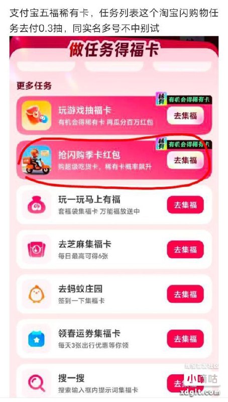 支付宝五福稀有卡,任务列表这个淘宝闪购物任务去付0.3抽,同实名多号不中别试