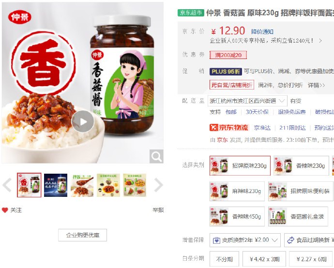 全品仲景香菇酱原味230g,3.26三只松鼠紫皮腰果500g/袋,21.1包