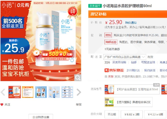 小诺海盐水鼻腔护理喷雾60ml,25.9,下单前联系客服全额返京豆