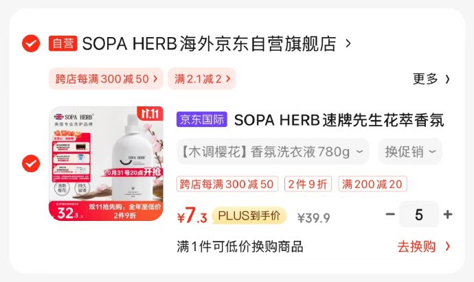 SOPA HERB速牌先生花萃香氛洗衣液780g,买5件,凑单折后7.3/件