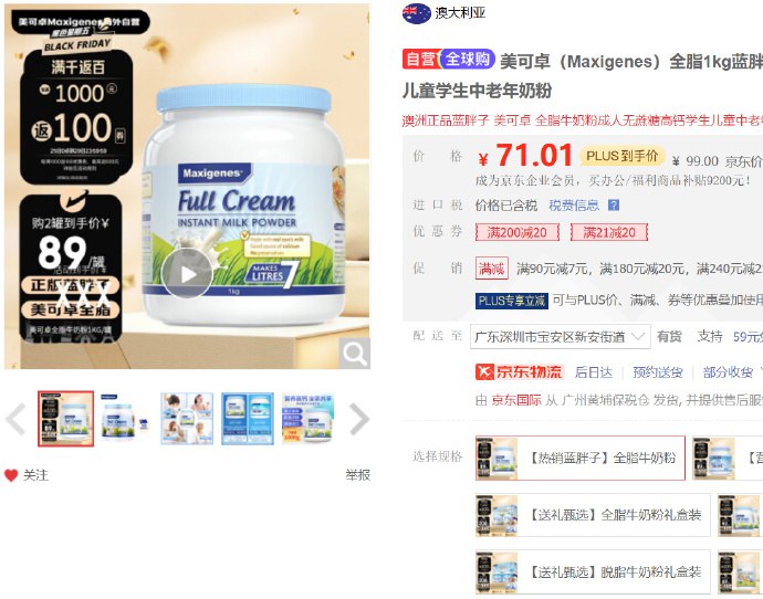 美可卓 全脂蓝胖子成人奶粉1kg,部分用户砸落21-20券,买1件
